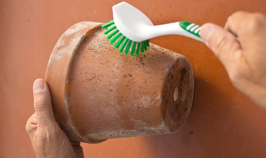 to clean containers is outside in the spring before planting, or in the fall after you discard dead and dying plants. Washing pots before planting has the added bonus of moistening terra cotta, which helps to keep soil from drying out during the first crucial day of transplanting.